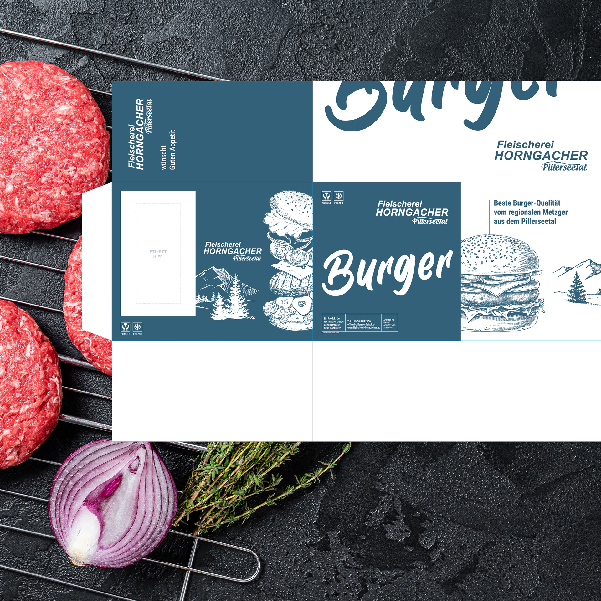 Gestaltung und Reinzeichnung // Transportkarton für Tiefkühlburger // Fleischerei Horngacher // Moodfotos zeigen nicht die Originallandschaft